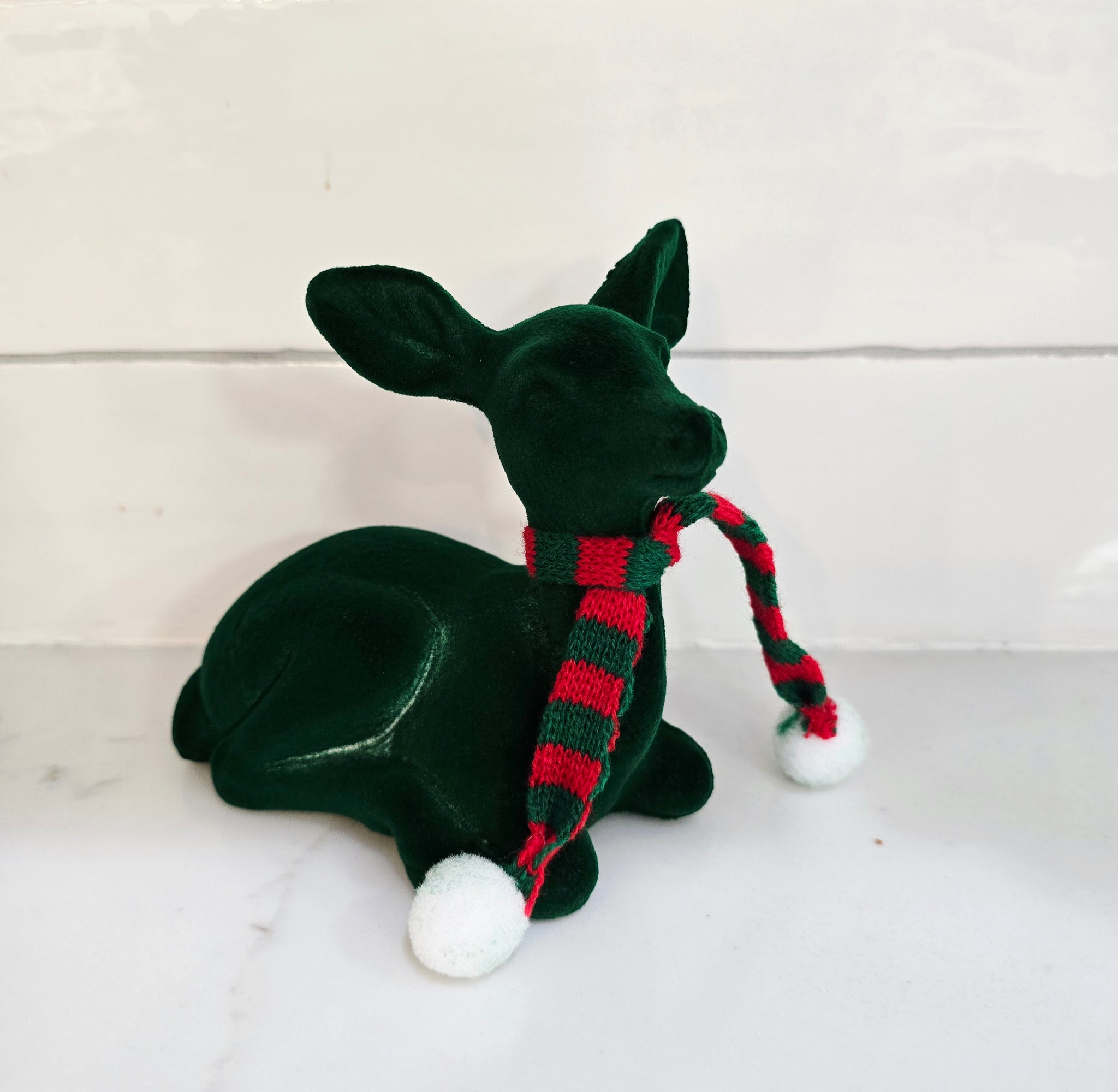 3 Velvet Reindeer Figures — A trio of adorable reindeer, each wrapped in a cozy striped scarf with playful pom-pom accents, bringing personality and warmth to your display.